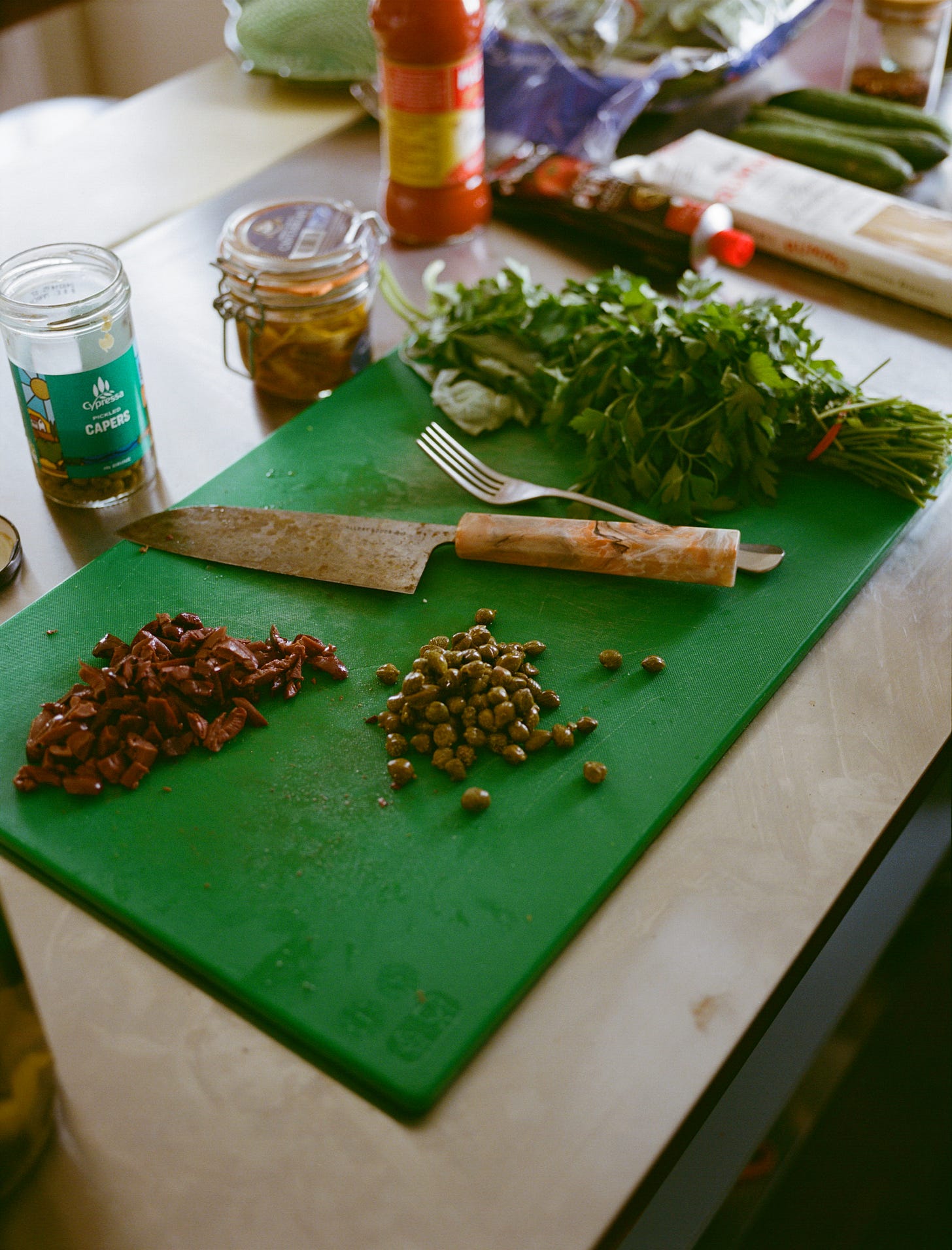 - 3 forkfuls of capers in brine, rough chopped